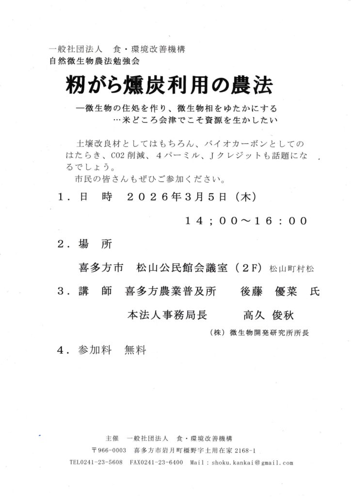 さて、法人活動4本柱の1本、自然微生物農法勉強会のお知らせです。